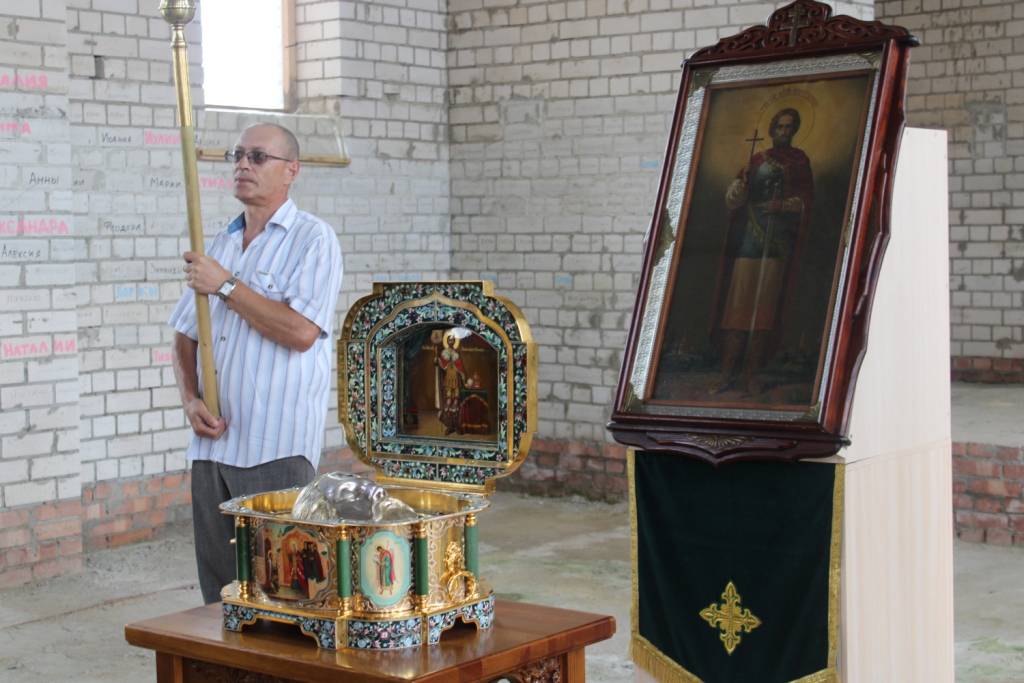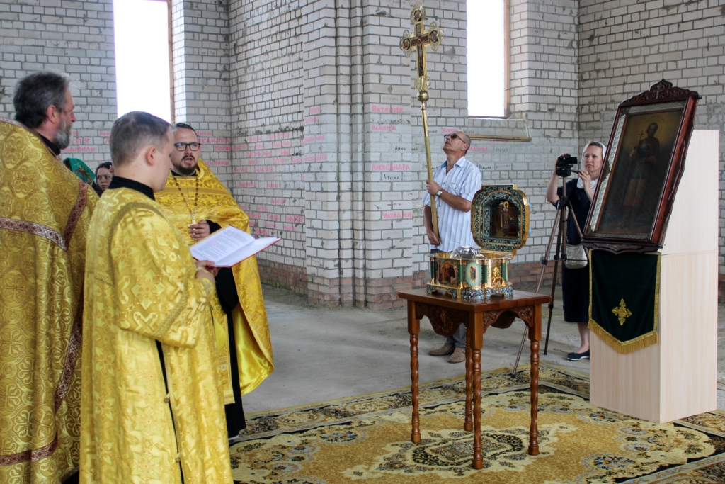 У стен строящегося Духовно-просветительского центра ковчег с честными мощами благоговейно приняли клирики новополоцкого храма во имя Архистратига Божия Михаила: протоиерей Валерий Рыжанков, иерей Андрей Бабушкин и диакон Тихон Антух. Духовенство, прихожане, жители и гости Новополоцка прошли крестным ходом в здание строящегося Центра с Михаило-Архангельским храмом.