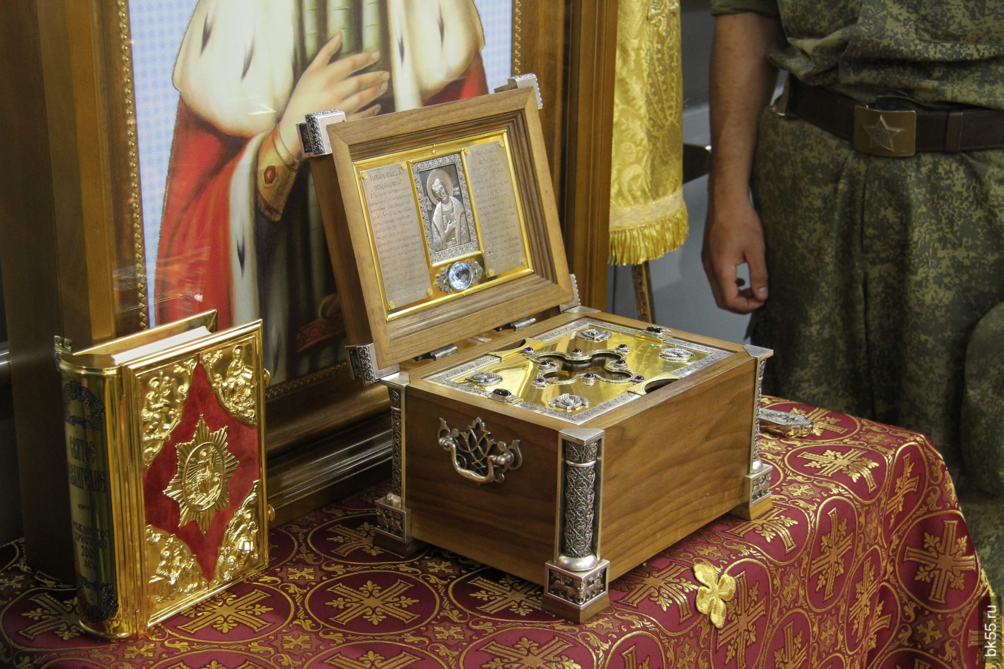 Святыни крестного хода – написанную к юбилейной дате икону и ковчег с частицей мощей святого Александра – торжественно встретили в Преображенском храме священнослужители и многочисленные прихожане, которые нашли возможность встретить крестный ход, несмотря на будний день.