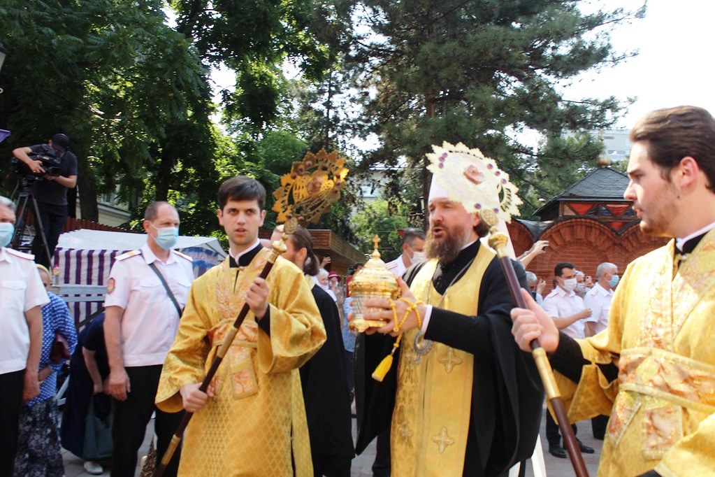 Митрополит Екатеринодарский и Кубанский Григорий внес святыню в собор, где собрались благочинные и настоятели храмов Краснодара, казаки, многочисленные верующие.